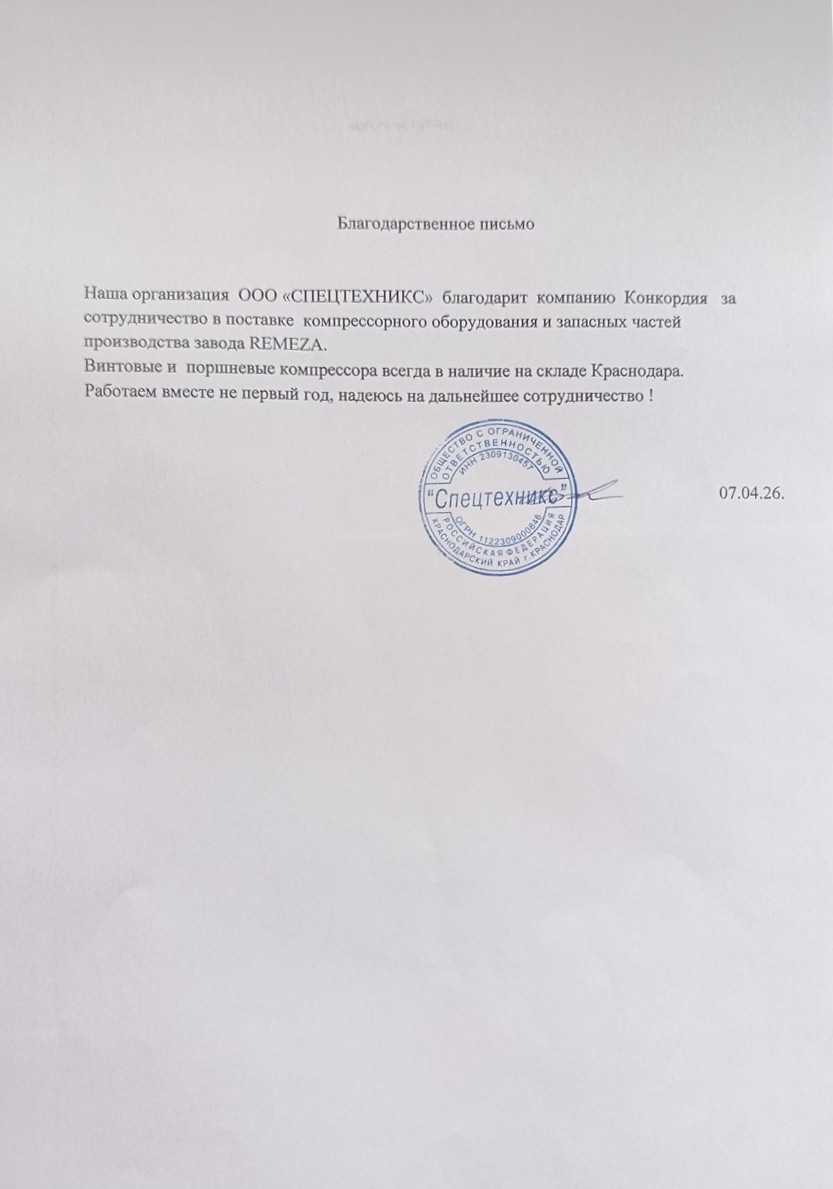Наша организация ООО «СПЕЦТЕХНИКС» благодарит компанию Конкордия за сотрудничество в поставке компрессорного оборудования и запасных частей производства завода REMEZA.